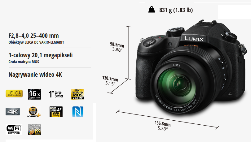Model LUMIX FZ1000 został wyposażony w dużą 1-calową matrycę i nowy jasny obiektyw LEICA z 16-krotnym zoomem optycznym umożliwiający mocne przybliżanie przy zachowaniu najlepszej jakości obrazu.